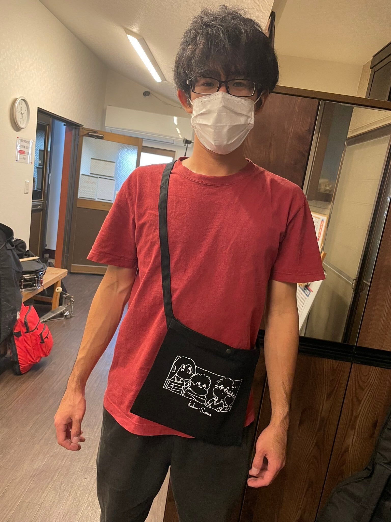 カメラマンのアミノン(@tun_712)によるデザインのサコッシュ。現物を見た松本が小さい声で「ええやん」と呟いた。